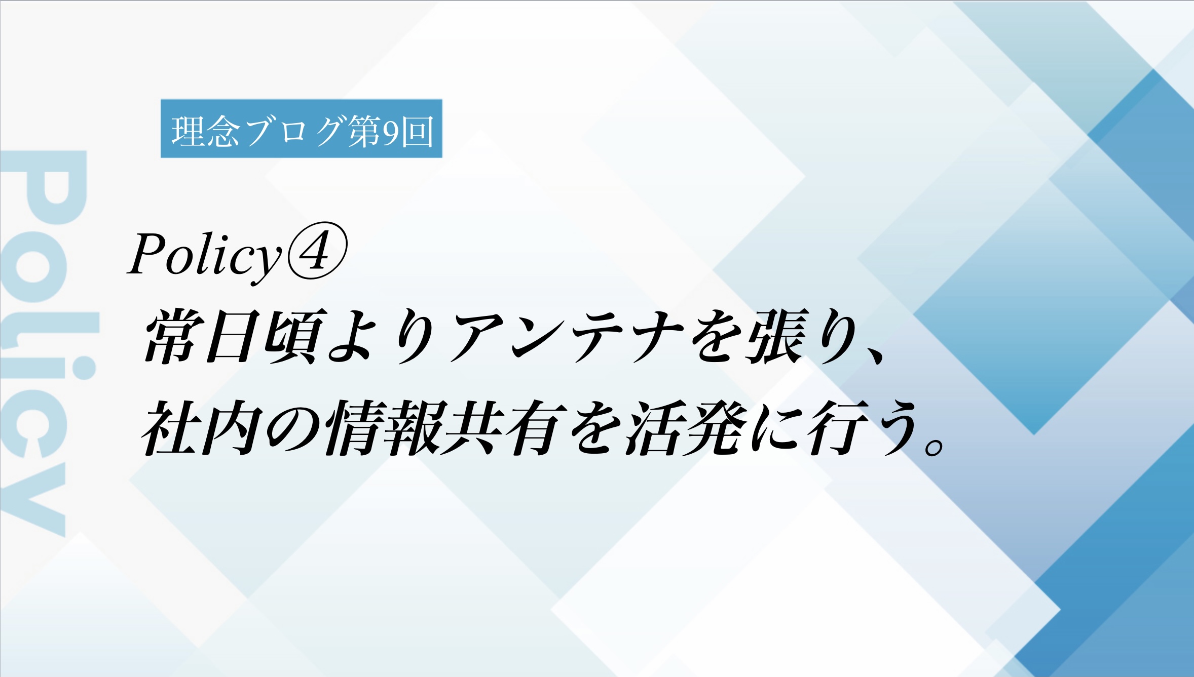 いつもブログをご覧いただきありがとうございます。 最近寒暖差が厳しいですね。 我が家では妻が換気を意識しており、就寝直前まで窓を開けているため風邪を引いてしまいそうです。皆様は適度に換気を行いつつ、体調管理に気を付けてください。 さて、今回はPolicy④「常日頃よりアンテナを張り、社内の情報共有を活発に行う」について語っていきます。 こちらはVision②「社員全員で創造性に富んだ商品・サービスの開発に取り組む。」の実現を目指すためのPolicyとなります。 弊社には専門的な知識を持ったメンバーが多く在席しています。しかしながら専門的知識が求められるが故に、提供できる商品・サービスが属人化している部分も否めません。 Vision②「創造性に富んだ商品・サービスの開発に取り組む」達成に必要なことは、情報を入手し、それを全社レベルで共有していくことが重要であるとの想いからこのポリシーを策定しました。営業のみならず従業員全員でこのポリシーを意識すれば、今まで以上に厚みのある新商品・新サービスの提供が可能になると考えています。 そして、情報共有の具体策としてこの度「製品情報共有会」をはじめることとなりました。各々の製品・営業活動での成功体験と知識を共有する場となっております。 情報共有というと難しいもののように感じられますが、些細なことから始めていくことが大切だと感じています。このPolicyを通じて、皆でより活発な組織にしていきたいと思います。 長くなりましたが今回は以上です。 次回はPolicy⑤についてです。 お楽しみに!!