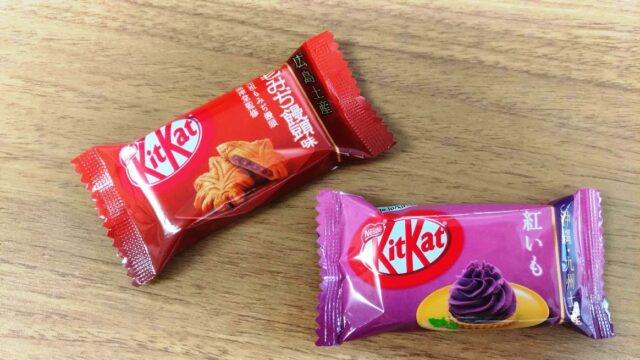 早速もみぢ饅頭味と紅いも味のキットカットを食べています。