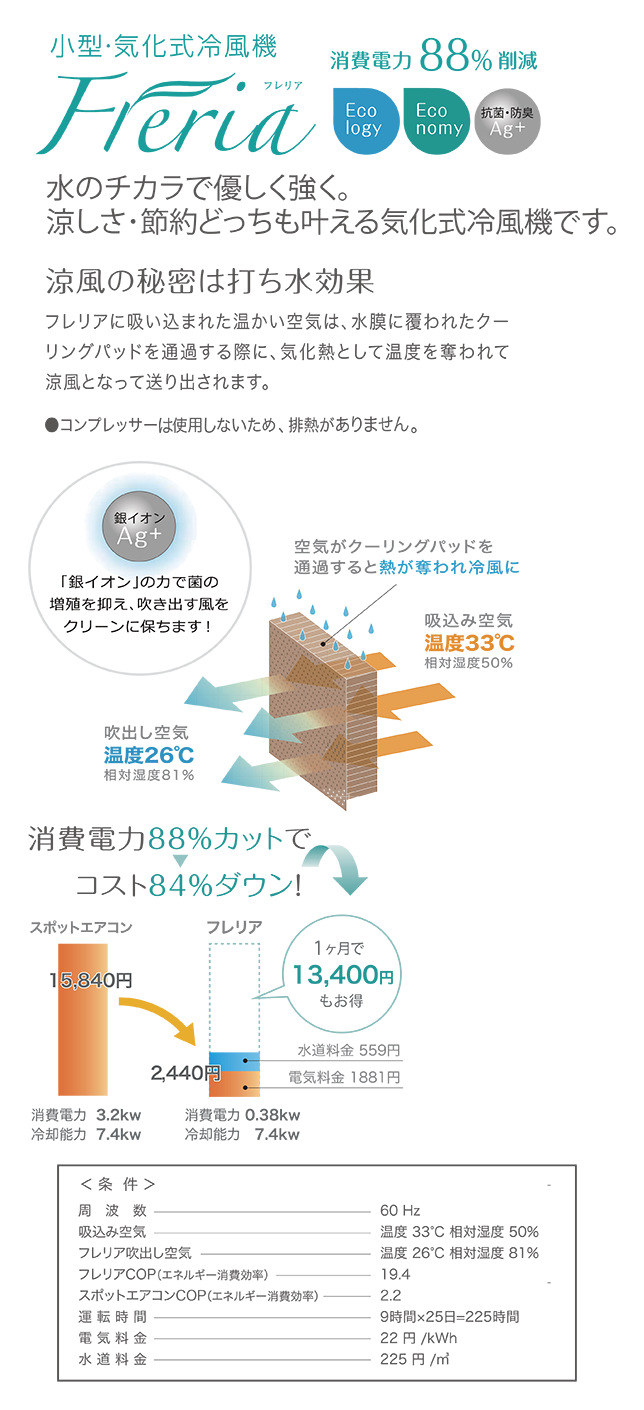 お財布にも環境にも優しいEcologe 涼風の秘密は打ち水効果。フレリアに吸い込まれた温かい空気は水膜に覆われたクーリングパッドを通過する際に、気化熱として温度を奪われて涼風となって送り出されます。コンプレッサー不使用のため、排熱がなく、壁にぴったり設置できます。「銀イオン」の力で菌の増殖を抑え、吹出す風をクリーンに保ちます!